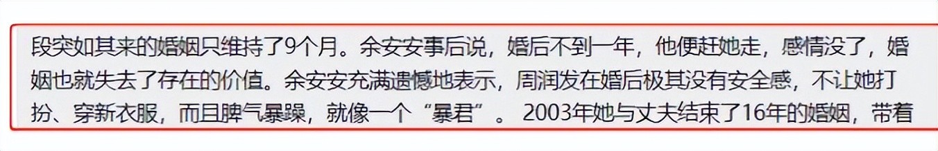 多年后,余安安曾经自爆,这换婚姻中,周润发一直没有安全感,根本就没有从“ZS”以及跟陈玉莲的那段感情中,走出来,他及其希望自己的妻子能够“听话”一些。