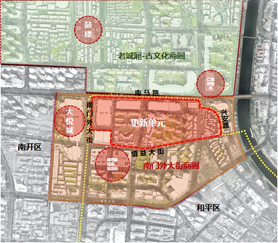 南门外大街和平一侧是天津重要的民俗文化聚集地,具有深厚的历史沿革,也是天津传统商业文化中心。2021年10月,天津市政府发布《天津市培育建设国际消费中心城市实施方案(2021-2025年)》。方案明确:以海河为轴,建设国际级的商业中心,承载国际消费中心城市核心功能。海河国际商业中心整体格局分为“一带九轴九商圈”,南门外大街商圈就是其中之一。南门外大街商圈占据城市中心地段,商业价值高,但大量闲置或低效利用的商业服务设施以及亟需改造的老旧小区,与南门外大街商圈城市发展高定位严重不符,亟需更新改造。