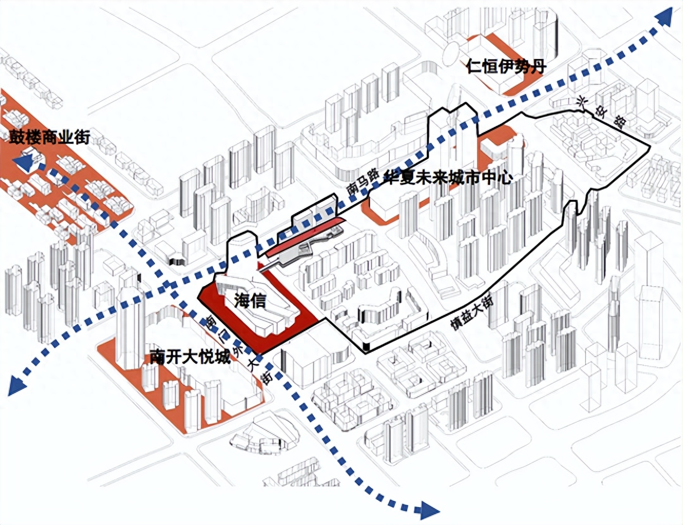 打造天津顶级商圈:拆除金耀广场,引入泰达海信广场,新建16万平米购物中心和甲级写字楼,与周边现有商业共同打造业态互补错位联动的天津顶级国际消费商圈。同时,结合商业办公等城市需求会有新建住宅。